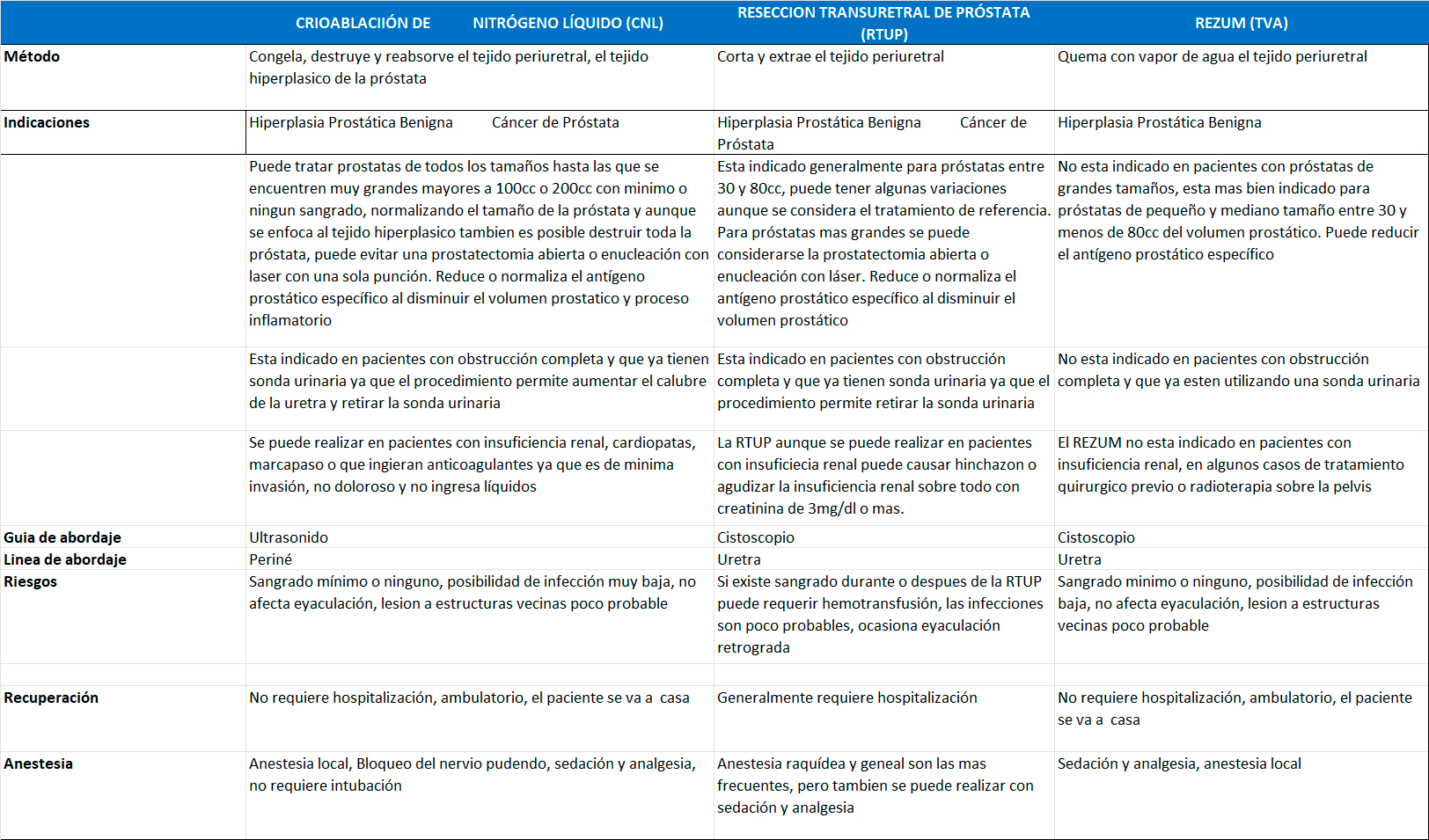 La Crioablación de Nitrógeno Líquido es un procedimiento de alta tecnología, que se aplica como una inyección a través del periné hasta llegar a la próstata, la cual congela, destruye a los nódulos y tejido hiperplásico de la próstata. La Crioablación de Nitrógeno líquido mejora el tamaño de la próstata, el flujo de la orina, el antígeno prostático especifico total, no produce alteraciones en la eyaculación, el funcionamiento sexual se mantiene conservado, el sangrado es mínimo o ninguno, es ambulatorio, no requiere hospitalización, no es doloroso, tiempo de recuperación 1 día.
